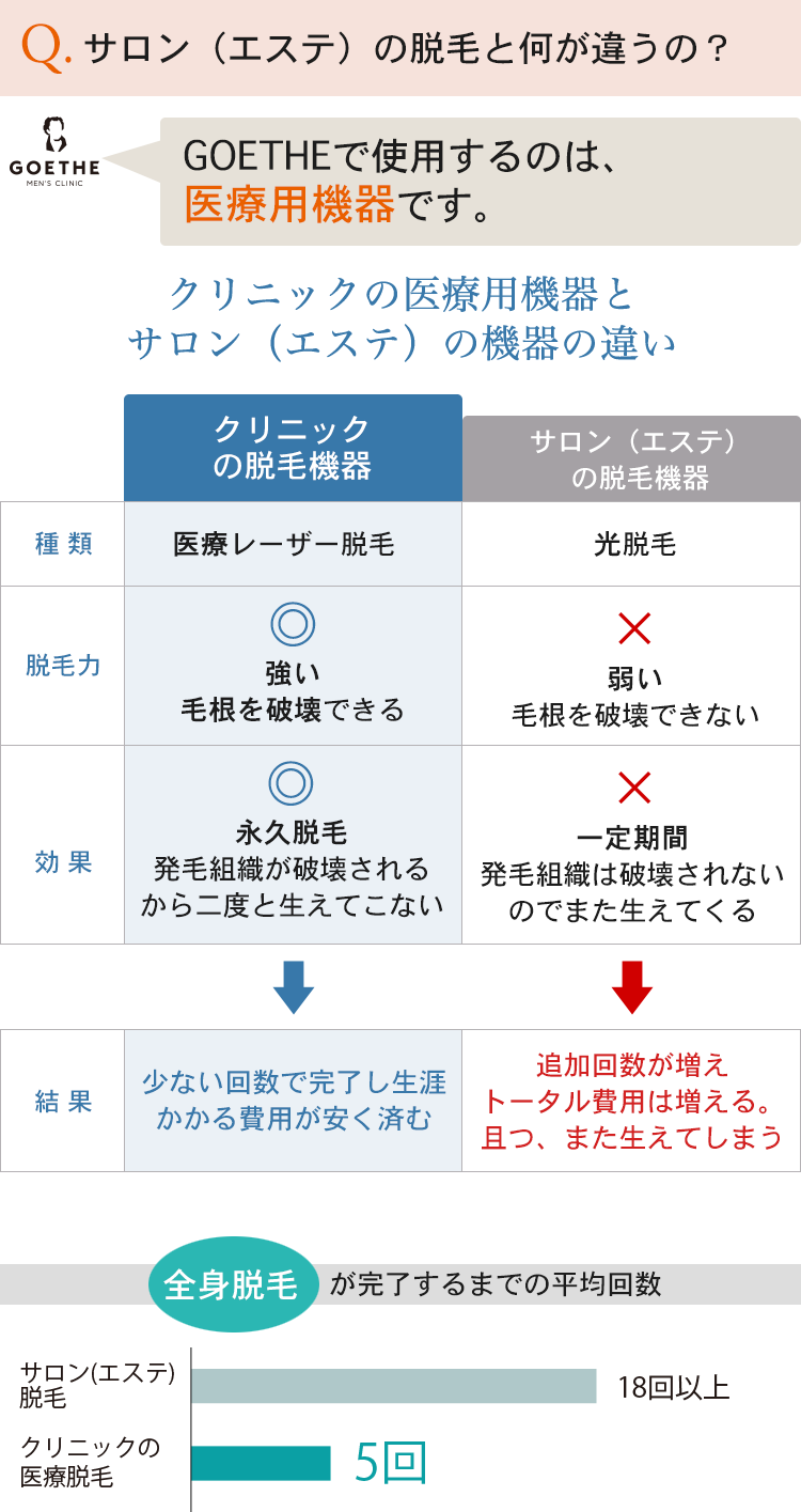 効果の高い「医療用の脱毛機器」の使用は、医療行為になるため、サロンやエステでは行えません。