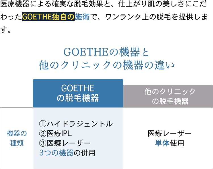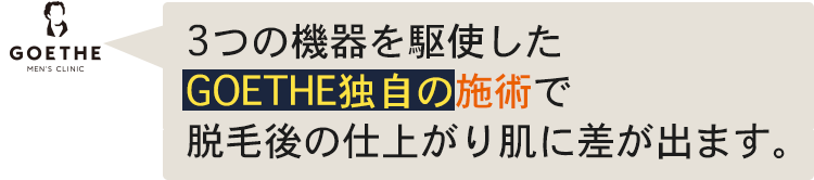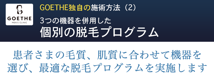 3つの機器の組み合わせは、初回のご来院時に、毛量・毛質・肌質を診させていただき、患者様に合わせて選択します。それぞれの患者様のお肌が最も美しくなる脱毛プログラムを提供します。