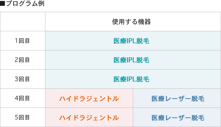 毛量が多いかたは、医療IPLを減らして医療レーザーとハイドラジェントルを増やすなど、患者さまにあわせて脱毛プログラムをカスタマイズします。