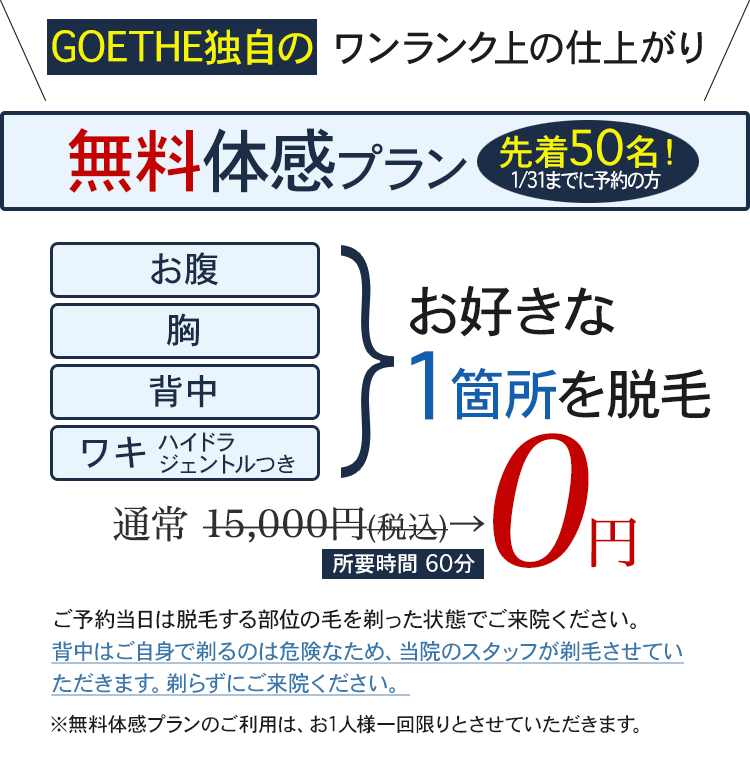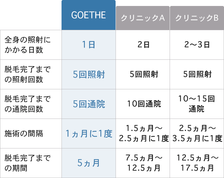 GOETHEでは最短5回で永久脱毛が完了します。脱毛クリニックの中には、一度に全身に照射ができず2日間から3日間に分けてするところもありますが、GOETHEは全身への照射が一度に行えます。