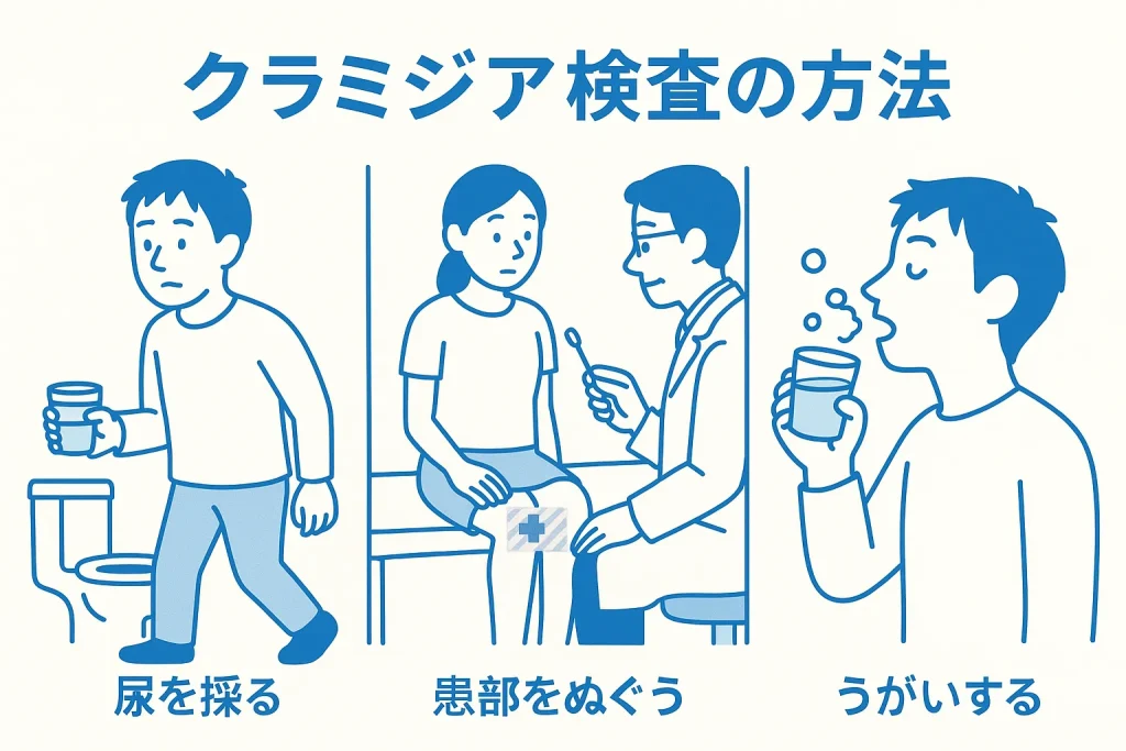 クラミジアではたいていの場合、感染部位や症状に合わせて、「尿を採る」「患部をぬぐう」「うがいする」のいずれかを行い、感染の有無を調べます。